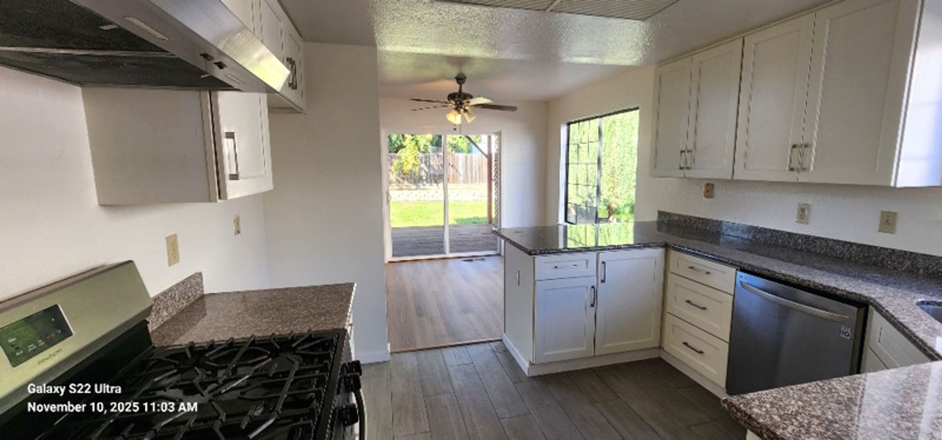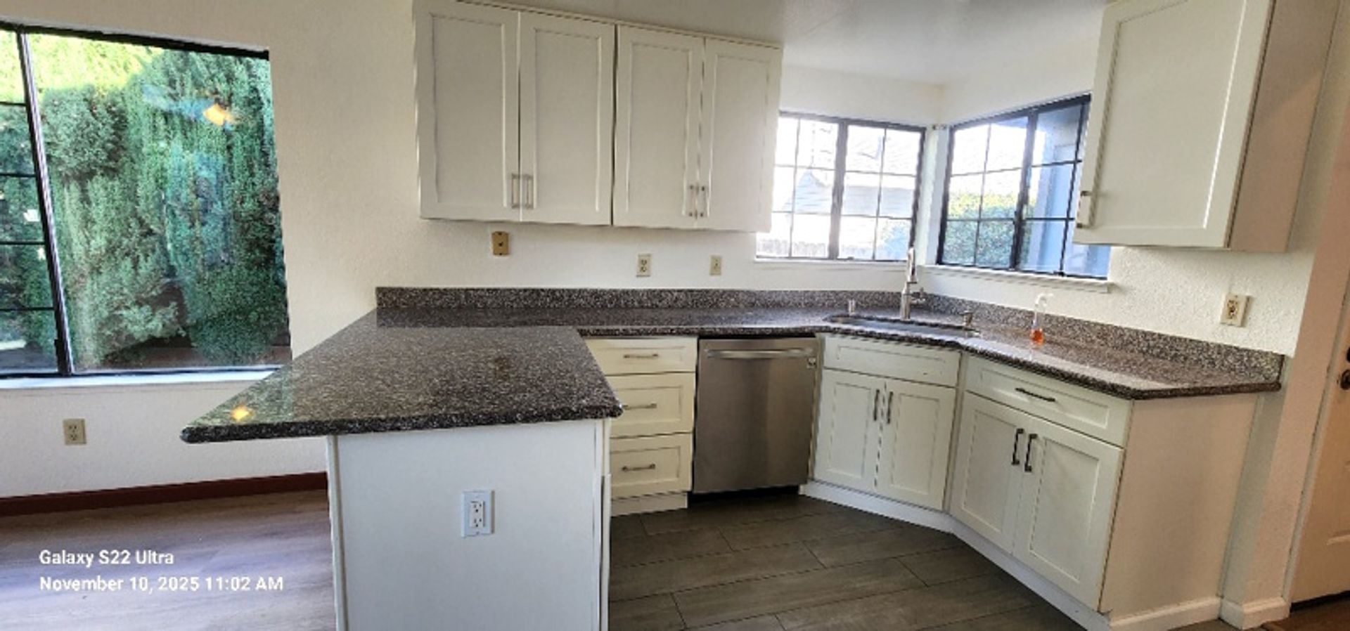 The kitchen boasts granite countertops, a stainless steel gas range, dishwasher, and a deep sink, any chef's dream!