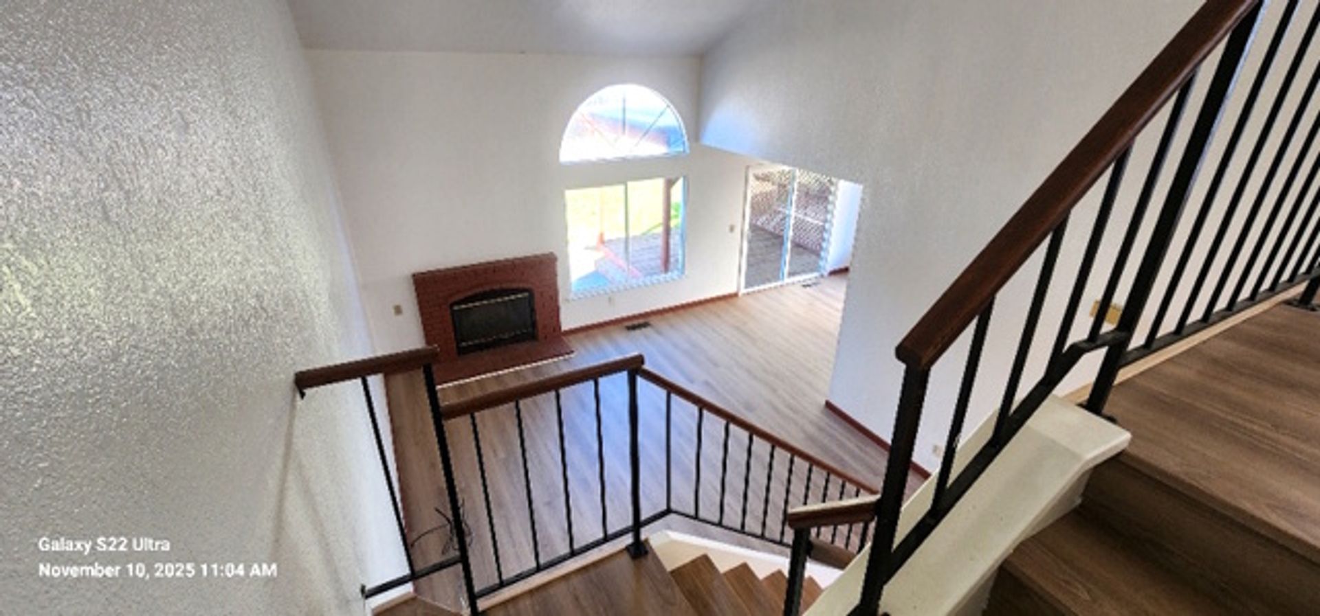 Enjoy stunning panoramic views from the top of the staircase down into the living room and cozy up by the fireplace in the light-filled living area during colder evenings. The large backyard with a deck, accessible through sliding glass doors from the eat-in kitchen, is perfect for barbecues and outdoor entertaining.